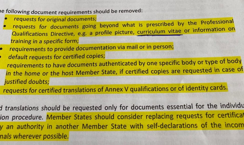 ”Document requirements – recognition of professional Qualifications” instrucțiune primită în 23.03.2021 de la Comisia Europeană de OBBCSSR ca autoritate competentă cf Legii 200/2004, elimină solicitarea CV la recunoașterea nivelului de calificare pentru exercitarea profesiei de ”BBC în sistmul sanitar”pentru că depășește cadrul legal stabilit de DE 36/2005 privind calificările profesionale.