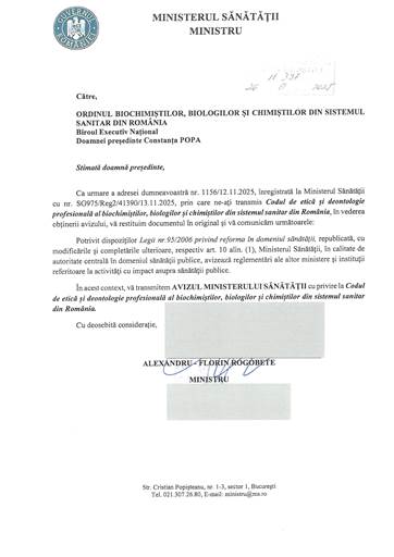 Însuși Ministrul Sănătății Dr. Alexandru Florin Rogobete a avizat favorabil Codul de etică și deontologie profesională al membrilor Ordinului Biochimiștilor, Biologilor și Chimiștilor în sistemul sanitar din România (OBBCSSR) cu număr de înregistrare chiar de la Cabinetul Ministrului, prin adresa numărul AFR 11397/26.11.2025, document care acum este public pe pagina de web www.obbcssr.ro.