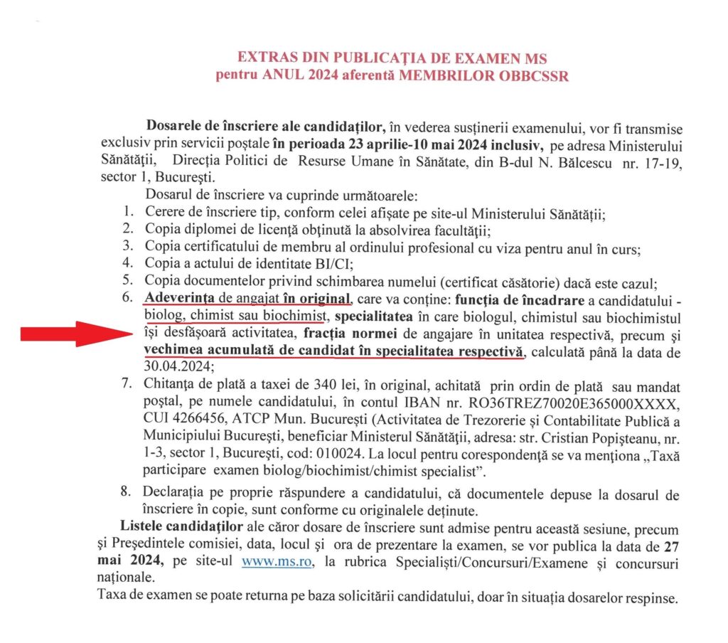 Ministerul Sănătății (MS) solicită membrilor OBBCSSR la prezentarea pentru examenele naționale organizate de MS ADEVERINȚA eliberată de unul sau mai multi angajatori laboratoare medicale ca respectivul membru al OBBCSSR care candidează la examenul național este angajat cu funcția de încadrare biochimist, biolog, chimist (NU altă funcție! de exemplu registrator medical, cercetător științific, fizician etc.) a lucrat și are o vechime/experiență de min. 4 ani ca ANGAJAT / salariat (NU PFI!) calculată până la sfârșitul anului calendaristic în care dorește să susțină examenul, în compartimentul laboratorului corespunzător monospecialității pe care dorește să o dețină de la MS; excepție de la această regulă face specialitatea ”Managementul calității pentru laboratoarele medicale” pentru care este necesară o adeverință de min. 4 ani experiență/vechime în sistemul sanitar.