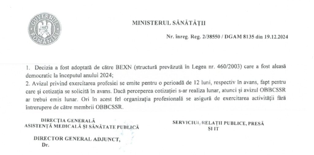 - Exista documente dovedite falsificate de catre membrii OBBCSSR primite la sediul OBBCSSR in luna decembrie 2024- falsificarea adeverintei de salariat angajat “ bbc ist in sistemul sanitar”, falsificarea OP ului de plata a cotizatiei si taxelor aferente aflate in analiza departamentului Juridic al OBBCSSR.