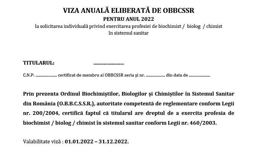 Fiecare membru al OBBCSSR va primi “Viza OBBCSSR“ pentru anul 2022 numai după completarea și transmiterea pe e-mail la unicul sediu al OBBCSSR (din București) a: