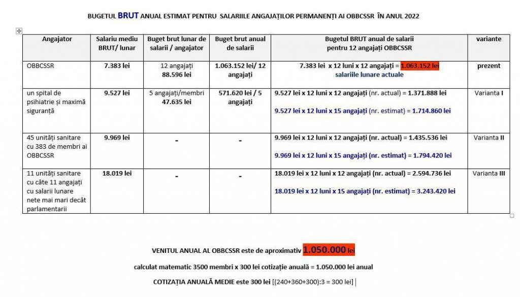 Venitul anual național al OBBCSSR calculat matematic de 1.050.000 lei (care NU va fi categoric crescut prin creșterea cotizațiilor membrilor OBBCSSR) nu poate acoperi nici măcar bugetul anual pentru salariile angajaților permanenți echivalente cu salariile individuale ale celor 5 bbc-iști angajați la un spital de Psihiatrie și maximă siguranță și în niciun caz echivalente cu salariile lunare nete egale cu ale unui exemplu de 3 bbc-iști angajați la stat care au salariile individuale lunare ”în mână” numai de la funcția de bază mai mari decât parlamentarii (peste 10.500 lei)
